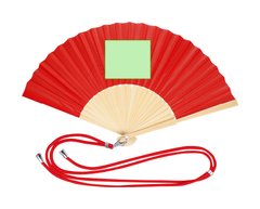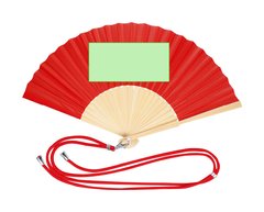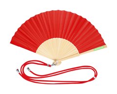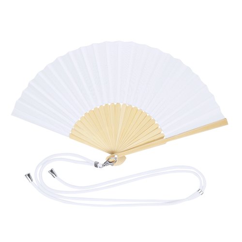 Abanico confeccionado con tela de resistente poliéster y varillas de flexible bambú. Incluye un cordón ajustable a juego con la tela y un práctico mosquetón metálico para fácil transporte.