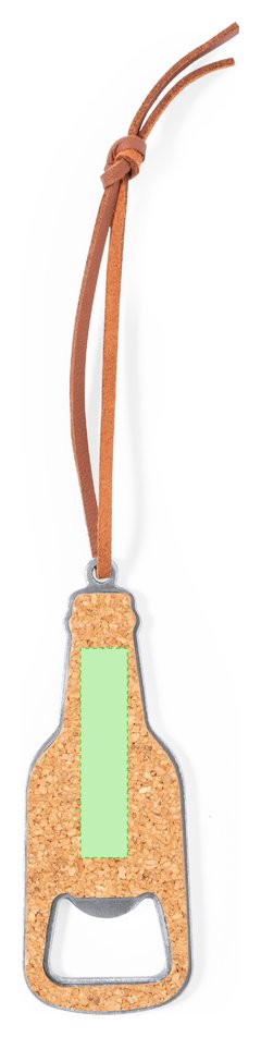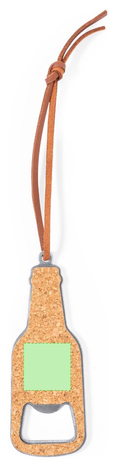 Abridor de botellas fabricado en corcho, adoptando la forma de un botellín. Su diseño incluye un cordón práctico que facilita su transporte y la opción de colgarlo cómodamente. Presentado individualmente en bolsa de papel reciclado. Elaborado con elementos vegetales para así fomentar la utilización de materias primas naturales y reducir las emisiones contaminantes.