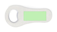 Abridor de botellas fabricado en caña de trigo. Cuenta con un imán que permite adherirlo a cualquier superficie metálica. Presentado individualmente en bolsa de papel reciclada. La caña de trigo fomenta la utilización de materias primas naturales, reduciendo así las emisiones contaminantes.
