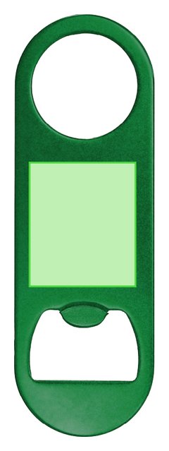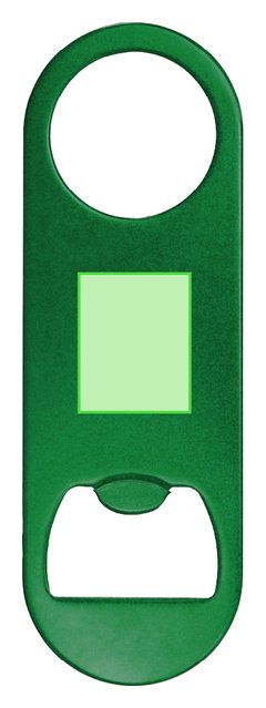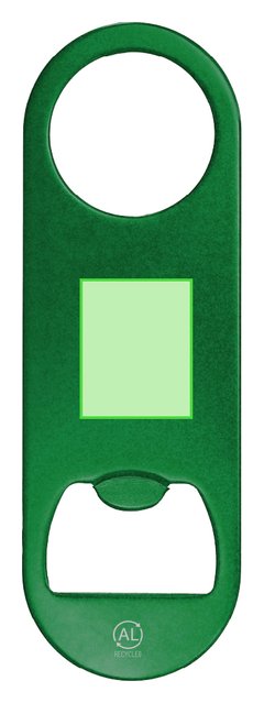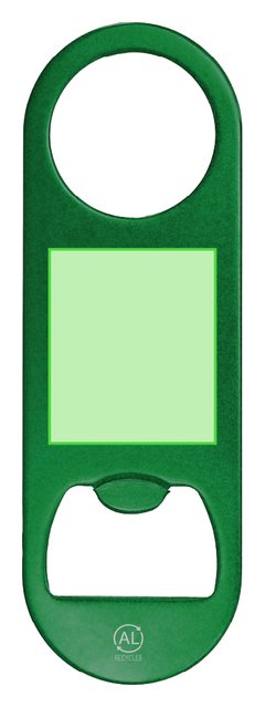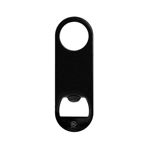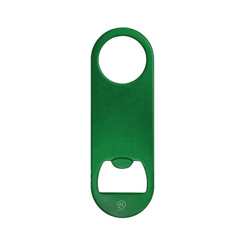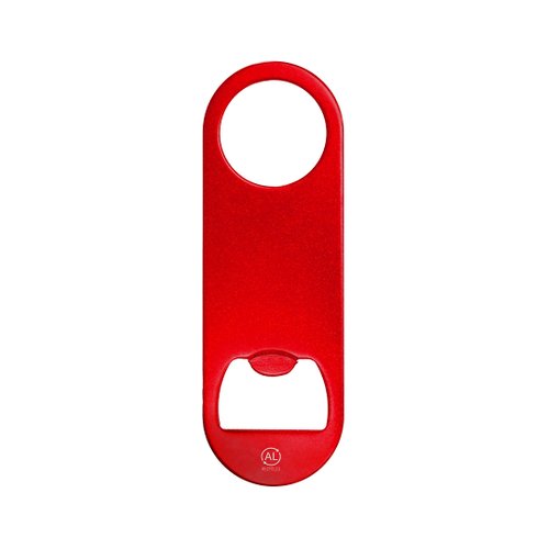 Abridor de Aluminio Reciclado con acabado metálico brillante. Un extremo con abridor de botellas y en el extremo opuesto con orificio circular de 3 cm de diámetro. Incluye logotipo Aluminio Reciclado.