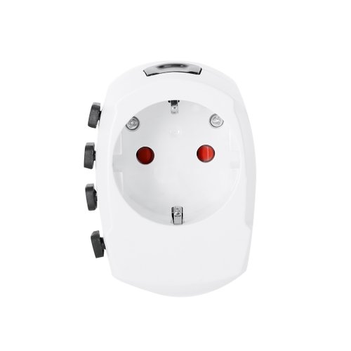 Completo adaptador de viaje universal marca SKROSS de diseño compacto y portable. Especialmente indicado para viajes y con adaptadores multi región. Apto para conectar dispositivos de alta potencia en cualquier lugar
