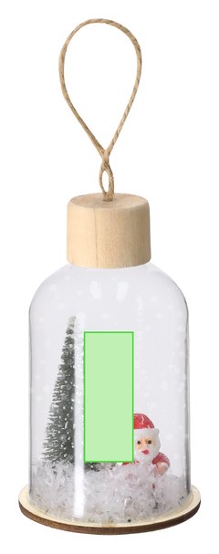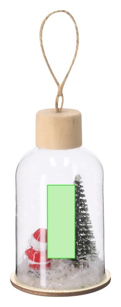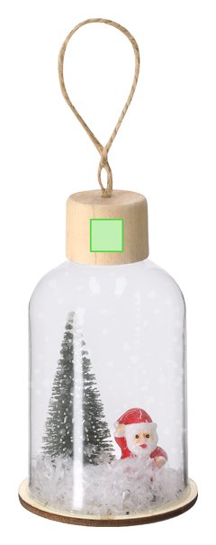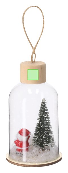Adorno navideño fabricado en resistente vidrio, con base de madera natural. Incluye accesorio para colgar en yute natural. Dispone de iluminación interior con 1 LED en tono blanco. Alimentación por 3 pilas de botón, incluidas, con botón ON/OFF en la base.
