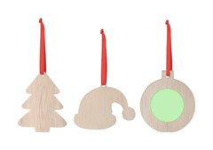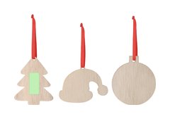 Adorno navideño fabricado en suave madera natural. Disponible en varios diseños: Gorro de Papá Noel, Árbol de Navidad y Bola de Navidad. Incluye lazo colgador en color rojo. Especialmente diseñado para marcaje en sublimación.Elaborado con elementos vegetales para fomentar así la utilización de materias primas naturales y reducir las emisiones contaminantes.