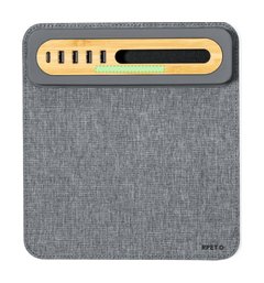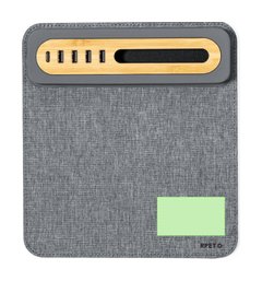 Elegante y funcional alfombrilla fabricada en combinación de suave poliéster RPET y bambú. Con puerto tipo C y cuatro puertos USB 2.0, permitiendo conectar y cargar los dispositivos fácilmente. Con soporte para smartphone y base antideslizante que garantiza un uso cómodo y estable. Introduce una nueva era de conectividad y sostenibilidad en el espacio de trabajo. Presentada en caja individual de diseño kraft y en bolsa reciclada. El material RPET se elabora a partir de plástico reciclado, para así fomentar la reutilización de residuos plásticos y ayudar a la sostenibilidad del planeta.