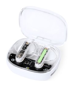 Auriculares intraurales en distintivo diseño transparente. Conexión Bluetooth® 5.3 y gran autonomía . De diseño ergonómico, incluyen botón de control táctil integrado en el auricular, con base de carga a juego e indicadores de estado de carga. Función manos libres. Puerto de carga con entrada Tipo C (cable incluido). Presentados en caja individual de diseño kraft y en bolsa reciclada.