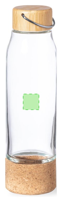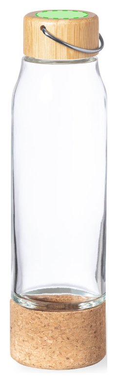 Bidón de línea nature y 470 ml de capacidad. Cuerpo fabricado en cristal, con base en corcho. Incluye original tapón a rosca de bambú con asa integrada. Presentado en caja individual de diseño eco.