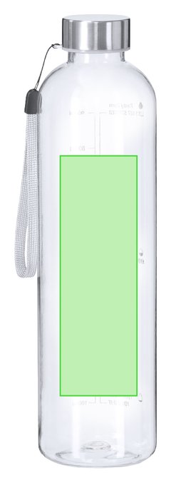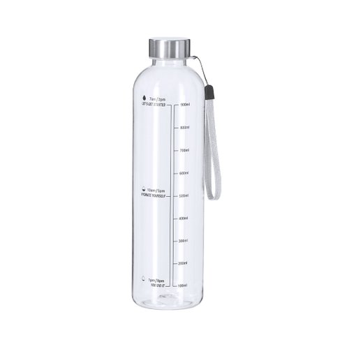Bidón fabricado en RPET de 1L de capacidad, diseñado para fomentar una hidratación adecuada. Con cuerpo transparente. Incluye indicador de capacidad en litros y onzas, acompañado de frases motivadoras que inspiran a mantener una correcta hidratación diaria. Tapón, elaborado en Acero Inox, incluye práctico cordón para facilitar su transporte. Libre de BPA.