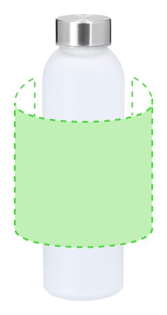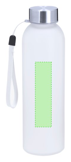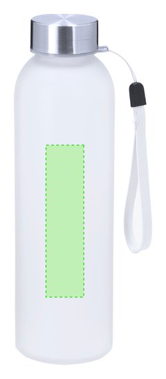 Bidón de 500 ml de capacidad, ideal para marcaje en sublimación. Cuerpo fabricado en cristal acabado frosted y tapón de acero inox libre de BPA. Incluye práctico cordón de para transporte.