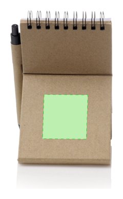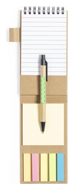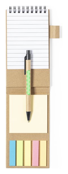Bloc de notas de línea nature convertible en soporte para smartphone y fabricado en cartón reciclado. Incluye: Bloc de anillas de 30 hojas blancas, con disposición a una raya y soporte para bolígrafo. Bolígrafo en cartón reciclado con detalles en negro, de mecanismo pulsador y en tinta azul. 25 notas adhesivas medianas. 125 mininotas adhesivas en varios colores.