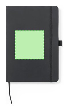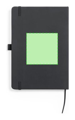 Bloc de notas fabricado en polipiel de elegante acabado en negro. Con tapas duras, marcapáginas y elástico de sujeción a juego. Interior con 100 hojas de disposición a 1 raya y soporte para bolígrafo (bolígrafo no incluido).
