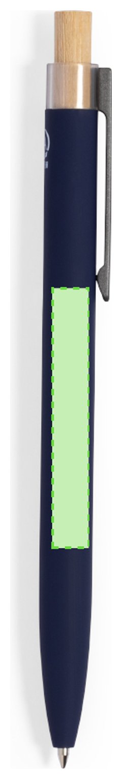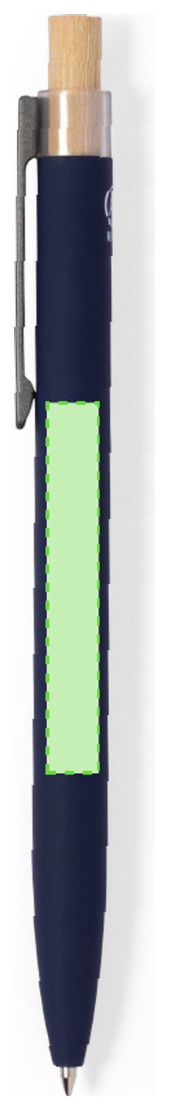Bolígrafo de mecanismo pulsador fabricado en aluminio reciclado. Pulsador en bambú y cuerpo acabado goma, disponible en variada gama de elegantes colores. Clip metálico y distintivo aluminio reciclado en la parte superior del bolígrafo. De cartucho jumbo y en tinta azul. Presentado en bolsa individual reciclada. El aluminio reciclado es un material con posibilidades de reciclaje casi infinitas, sin perder sus propiedades originales y consumiendo menos energía en este proceso. Certificación GRS (Global Recycled Standard / Estándar de Reciclaje Global), que garantiza el origen reciclado del material usado para fabricar el producto.