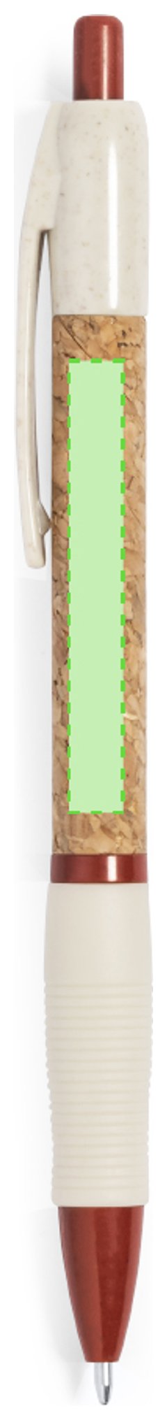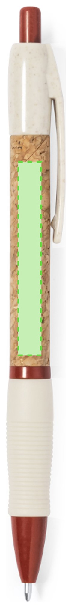 Bolígrafo de mecanismo pulsador con cuerpo en corcho natural. Clip, punta y pulsador en caña de trigo. Disponible en variada gama de colores. Distintivo Wheat Straw en la parte superior del bolígrafo. En tinta azul. Elaborado con elementos vegetales, para así fomentar la utilización de materias primas naturales y reducir las emisiones contaminantes.