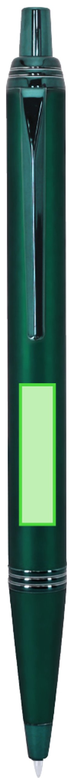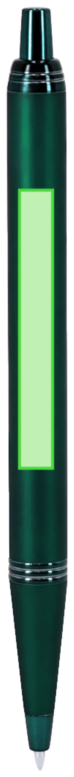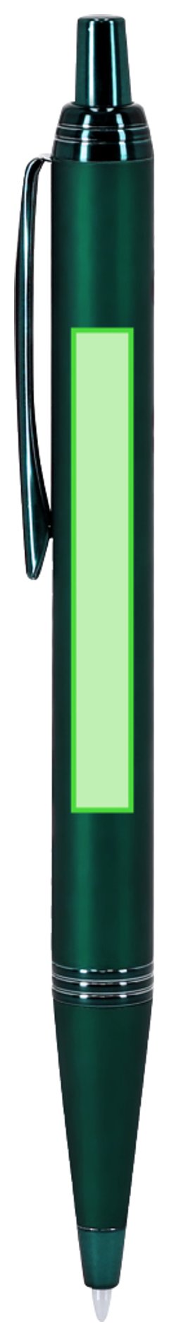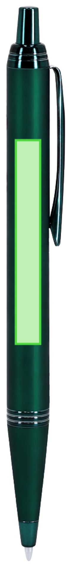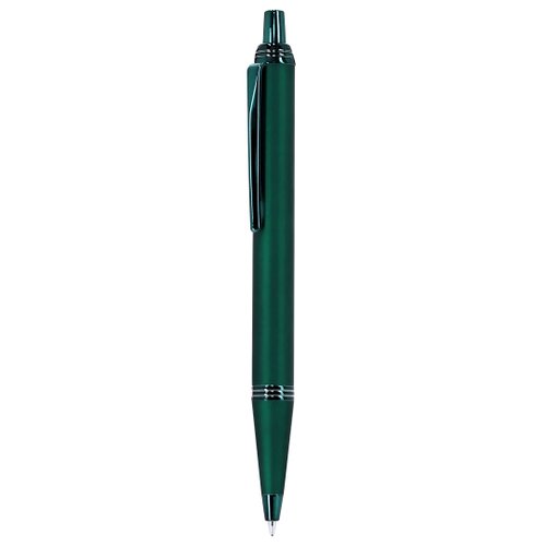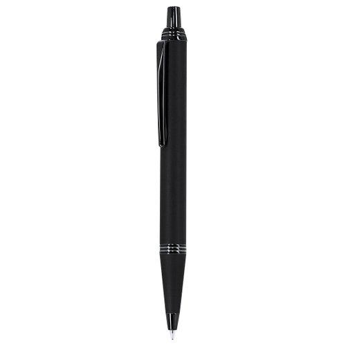 Bolígrafo con cuerpo en aluminio, acabado gomoso y detalles cromados. De mecanismo pulsador, con cartucho jumbo y tinta azul.