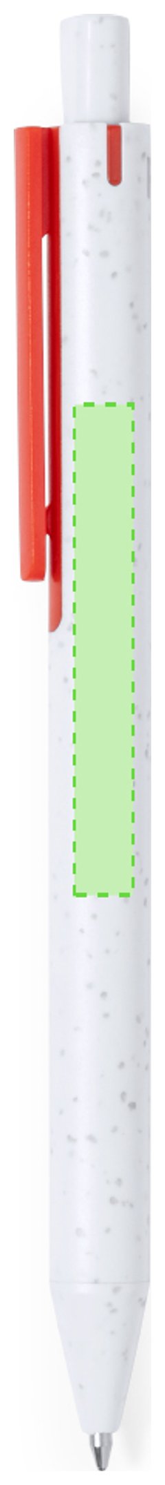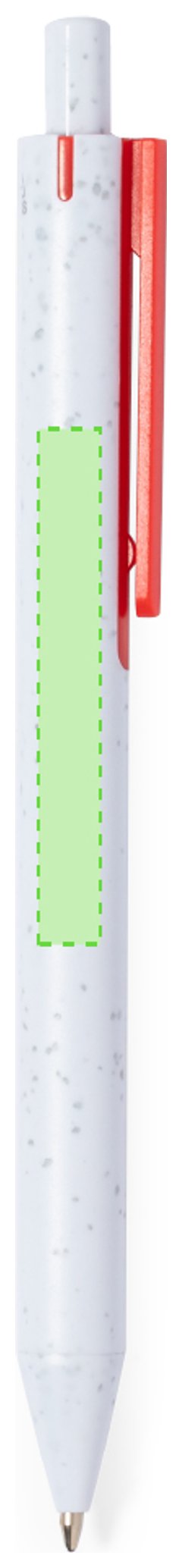 Bolígrafo de mecanismo pulsador fabricado en ABS reciclado. Con clip en vivos colores y cuerpo de suave acabado en color blanco sólido. Distintivo ABS reciclado en la parte superior del bolígrafo. En tinta azul.
