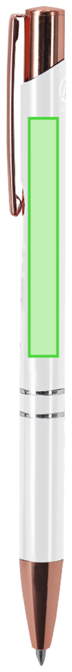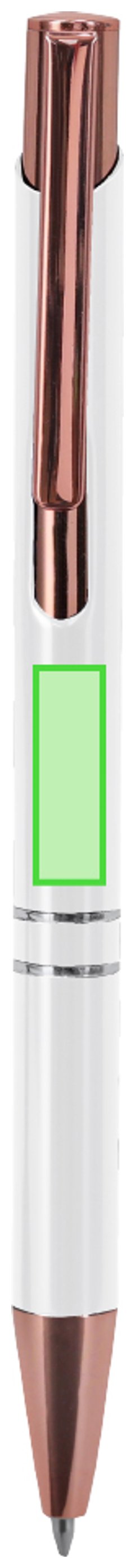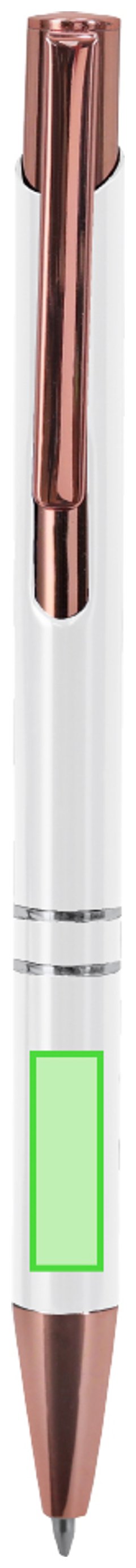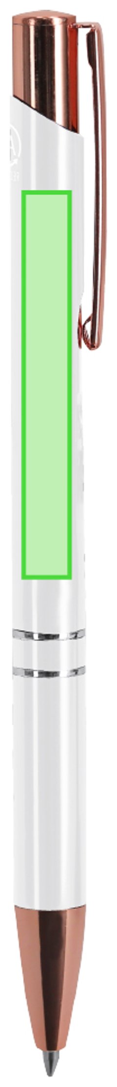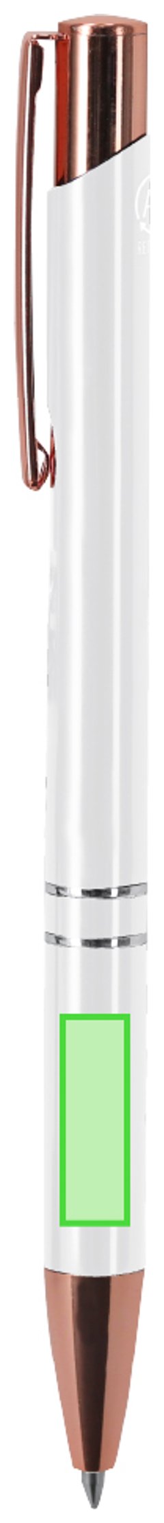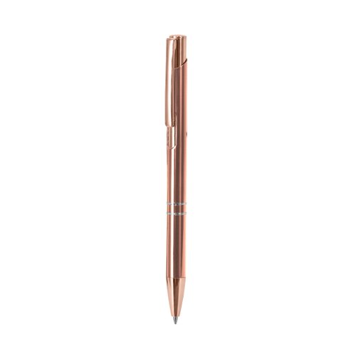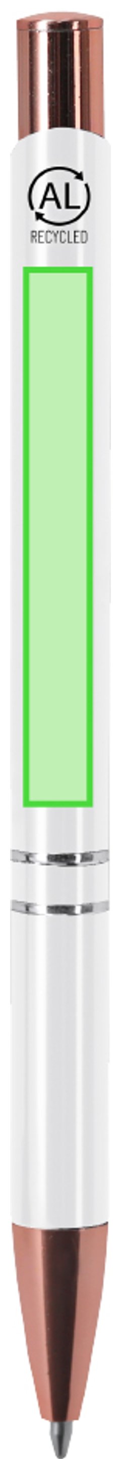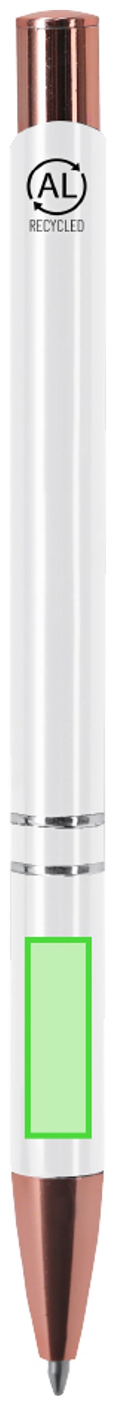 Bolígrafo de mecanismo pulsador fabricado en aluminio reciclado. Incluye accesorios plateados y clip, pulsador y punta en acabado rose gold. Tinta azul. Distintivo aluminio reciclado en la parte superior del bolígrafo.