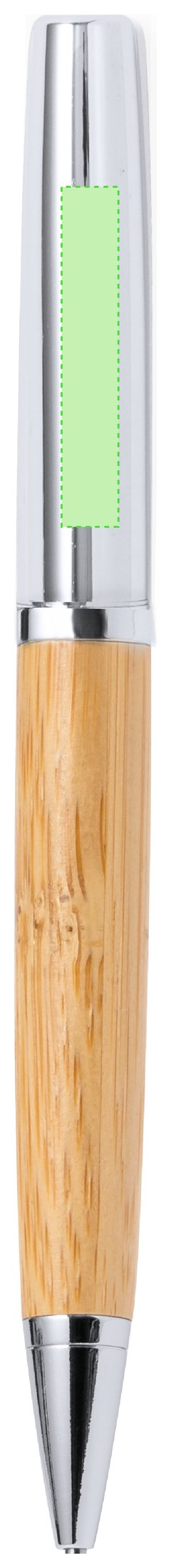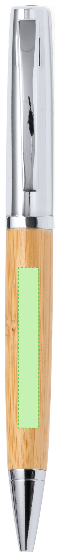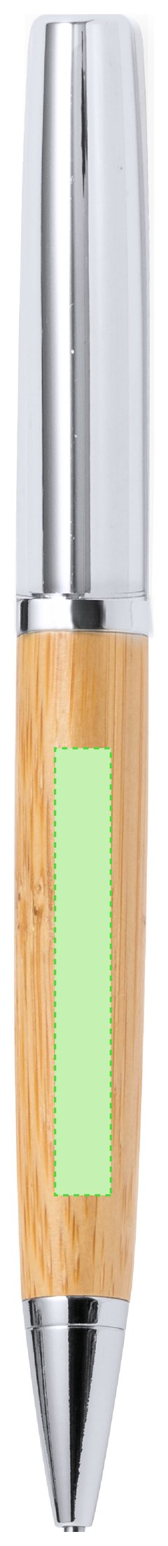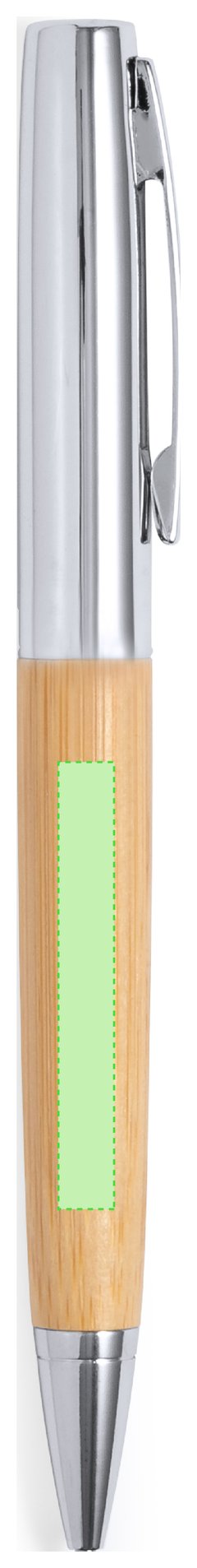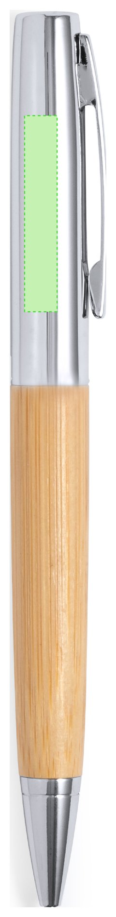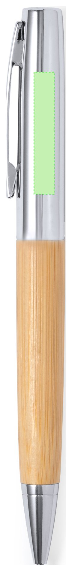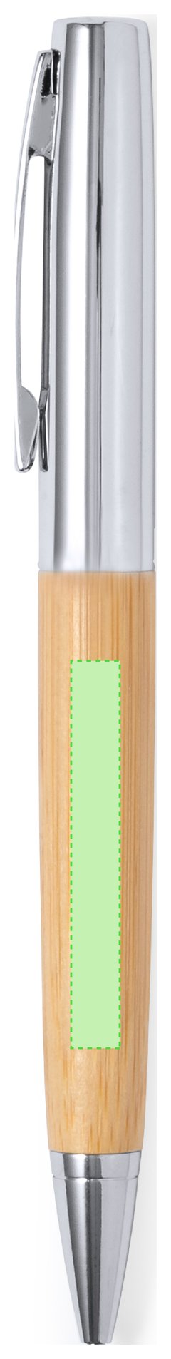 Elegante bolígrafo de bambú y metal con mecanismo giratorio. Cuerpo en resistente metal de acabado brillo y empuñadura en bambú . Clip metálico y en tinta azul. Presentado individualmente en un estuche de bambú. Materiales como el bambú fomentan la utilización de materias primas naturales, reduciendo las emisiones contaminantes. Proviene de una planta de gran resistencia y versatilidad, con crecimiento y regeneración rápidos, siendo una excelente alternativa al uso de madera tradicional.