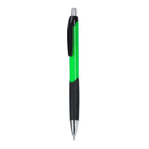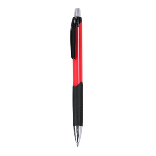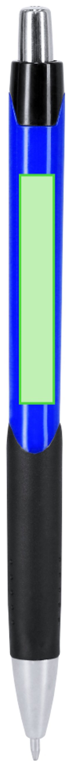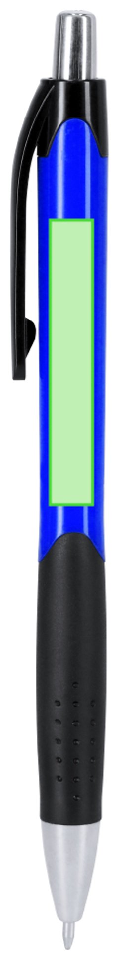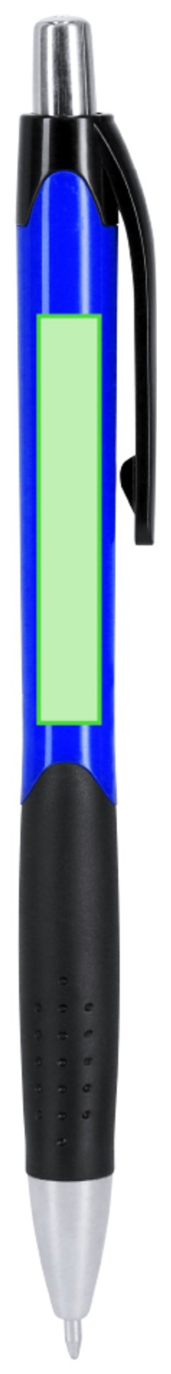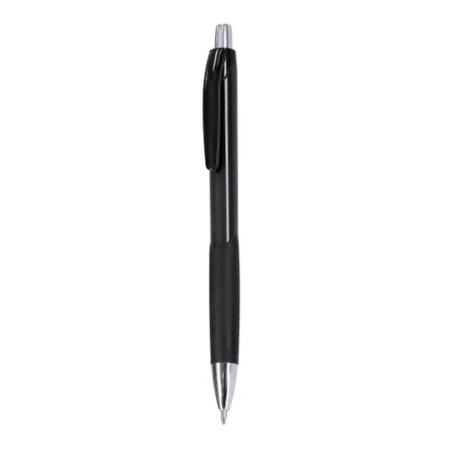 Bolígrafo de mecanismo pulsador en resistente ABS. Fabricado en elegante combinación de cañ . Clip de tono negro. Con pulsador y punta en tono plateado, grip con acabado gomoso y cuerpo brillante. En tinta azul.