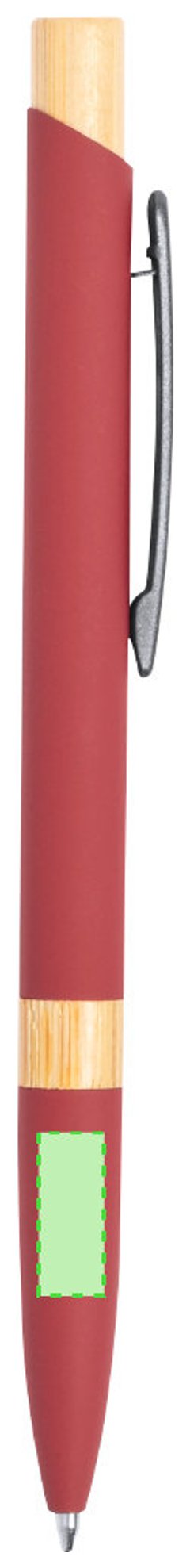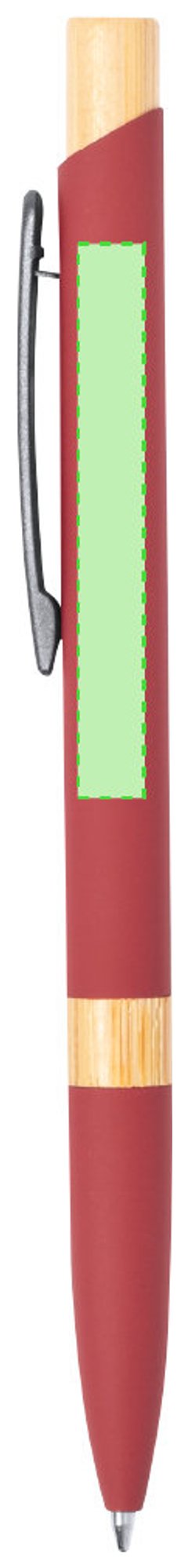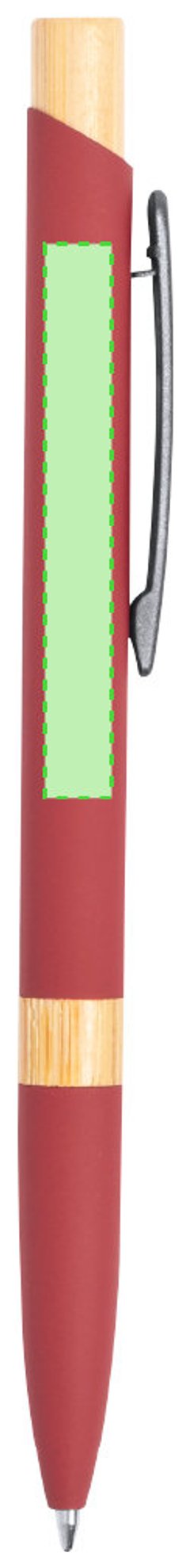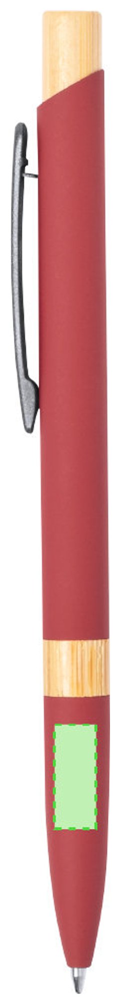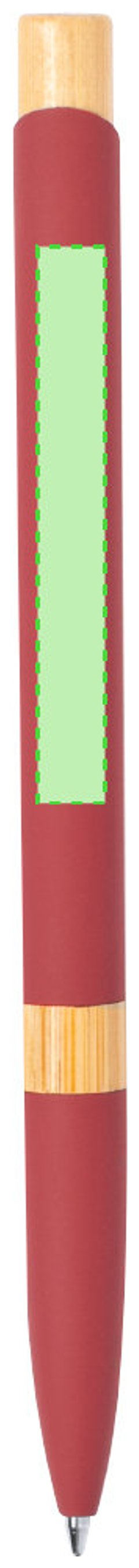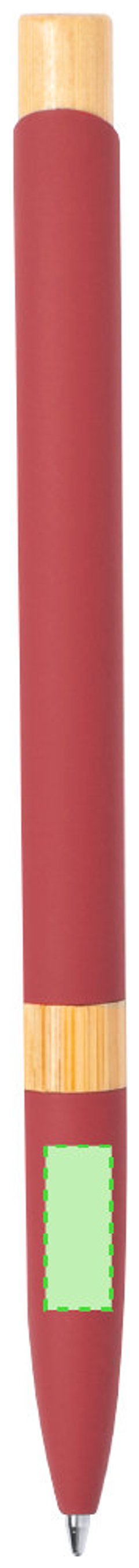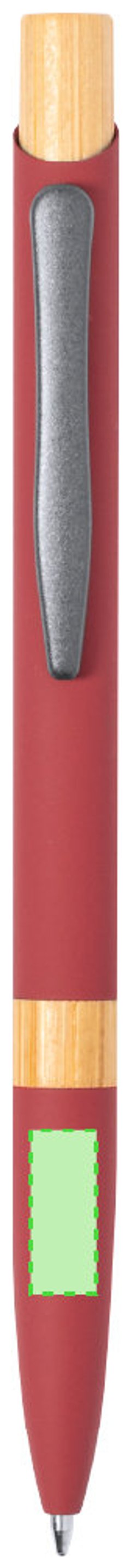Elegante bolígrafo de aluminio con mecanismo pulsador. Cuerpo en resistente aluminio de acabado goma mate y con detalles en bambú, con caña en una amplia gama de distintivos colores. Clip metálico, de carga jumbo y en tinta azul. Presentado en bolsa individual reciclada. Materiales como el bambú fomentan la utilización de materias primas naturales, reduciendo las emisiones contaminantes. Proviene de una planta de gran resistencia y versatilidad, con crecimiento y regeneración rápidos, siendo una excelente alternativa al uso de madera tradicional.