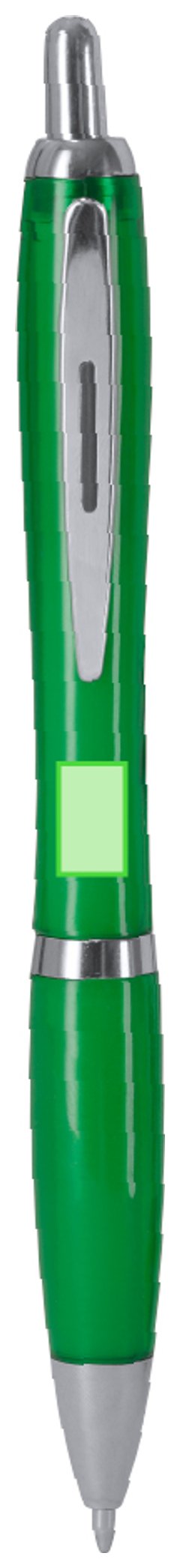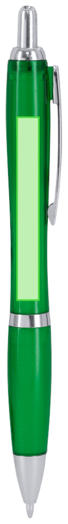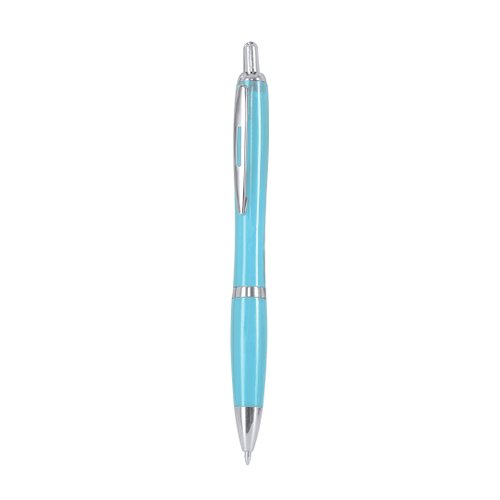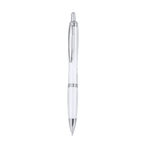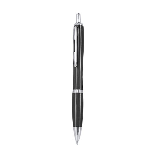 Bolígrafo de mecanismo pulsador en resistente RPET. Fabricado en elegante diseño con accesorio plateado. Con pulsador, clip y punta en combinación. En tinta azul.
