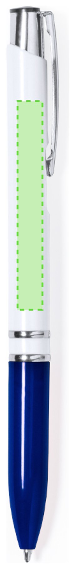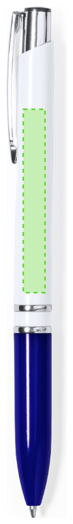 Elegante bolígrafo con mecanismo pulsador. Con cuerpo acabado en color blanco brillo y empuñadura en variada gama colores. Fabricado en resistente ABS acabado brillo. Con carga jumbo y tinta azul.