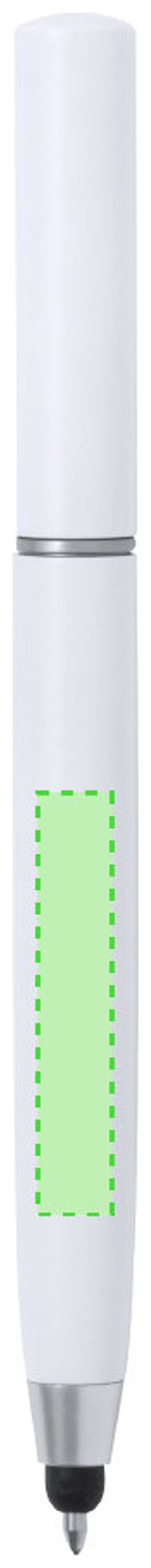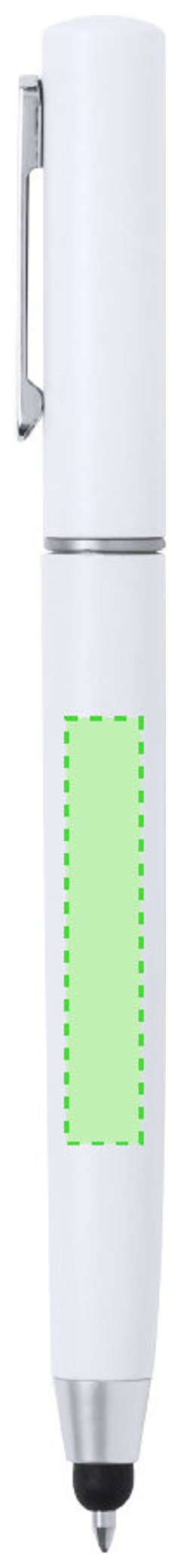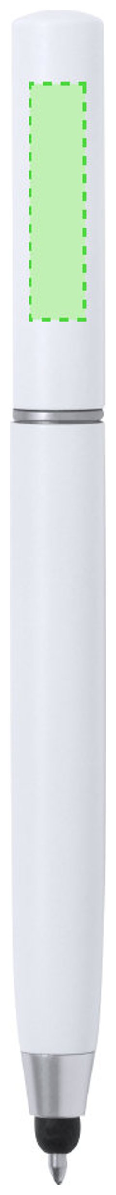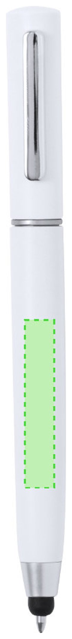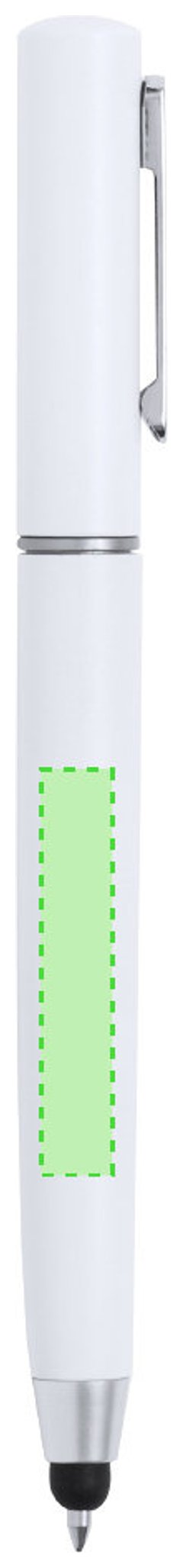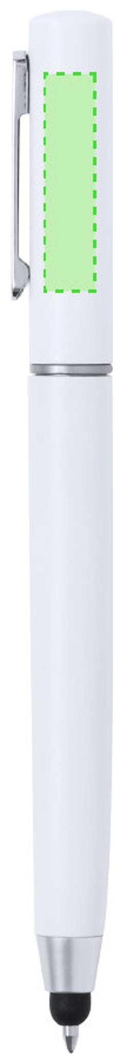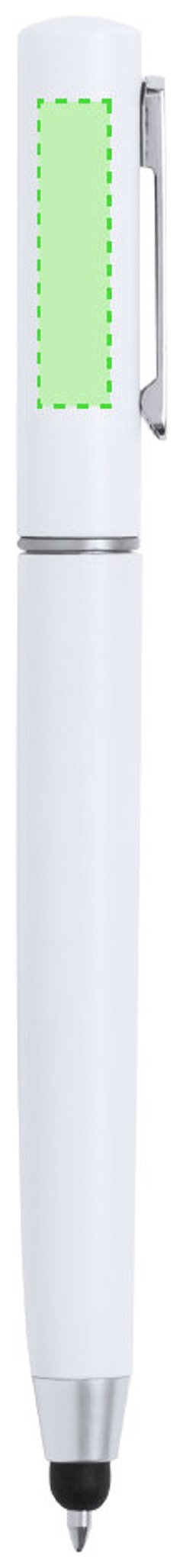 Práctico bolígrafo puntero de mecanismo giratorio, con accesorios de limpieza alojados en la parte superior de la caña. Incluye un cepillo y una punta metálica protegidos por una capucha. Con clip metálico y en tinta azul. Disponible en varios colores y presentado individualmente en caja de diseño kraft.