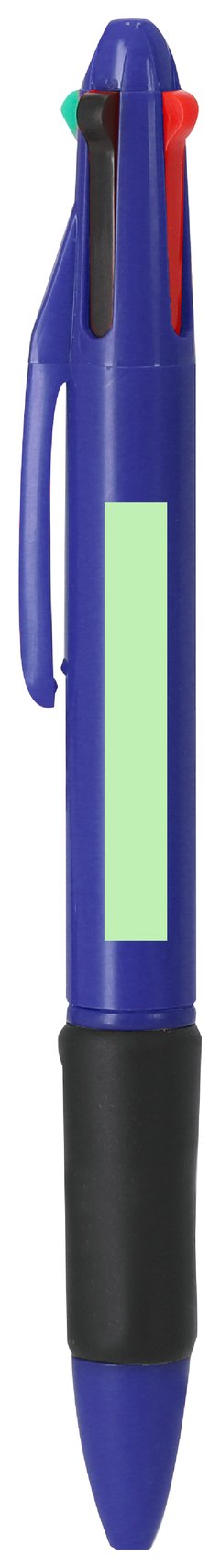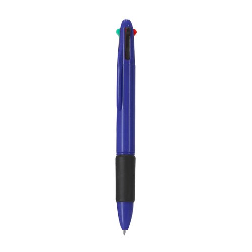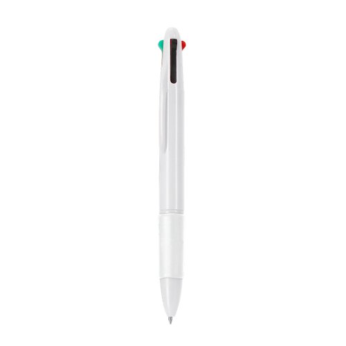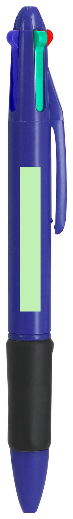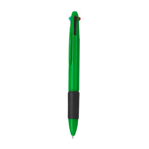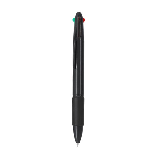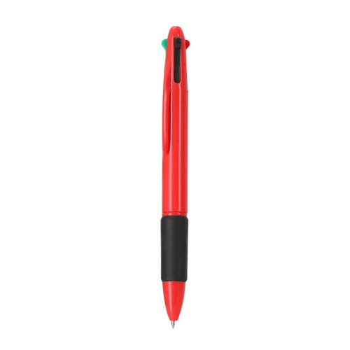 Bolígrafo multicolor fabricado en resistente ABS Reciclado. Con empuñadura en acabado goma. 4 en 1 con mecanismo pulsador retráctil. De 4 cartuchos en tinta azul, roja, negra y verde. Con distintivo logotipo RABS.
