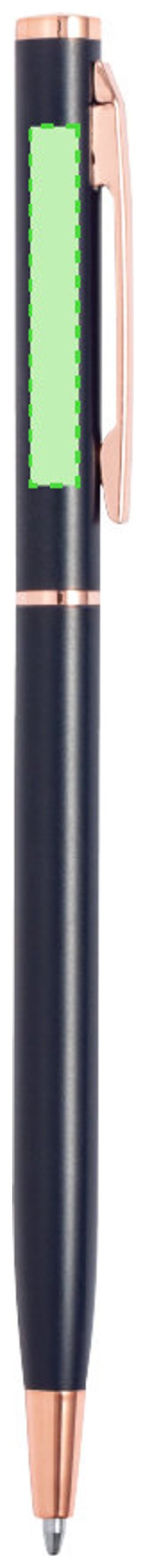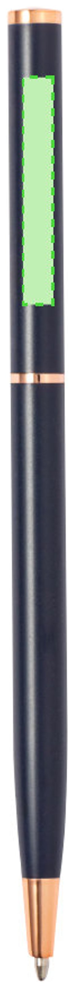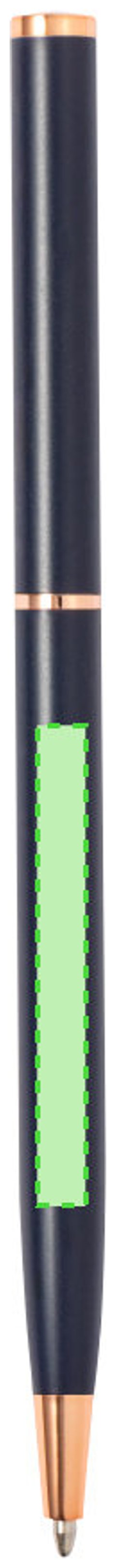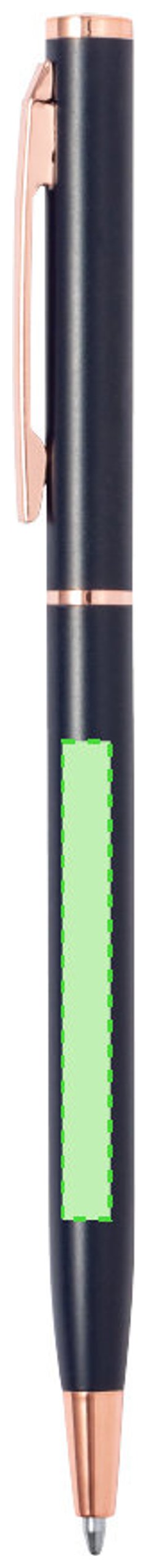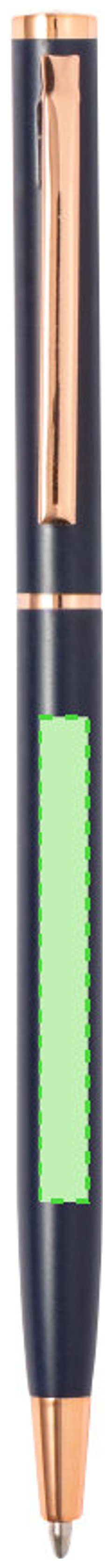 Excelente bolígrafo de aluminio con mecanismo giratorio. Cuerpo en resistente aluminio de acabado mate con elementos decorativos de elegante acabado color cobre, con la caña en una amplia gama de distintivos colores. Clip metálico y de tinta azul. Presentado en una bolsa individual reciclada.