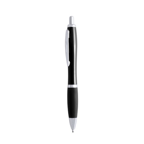 Bolígrafo de mecanismo pulsador en resistente ABS. Clip, pulsador y punta en plateado. En tinta negra.