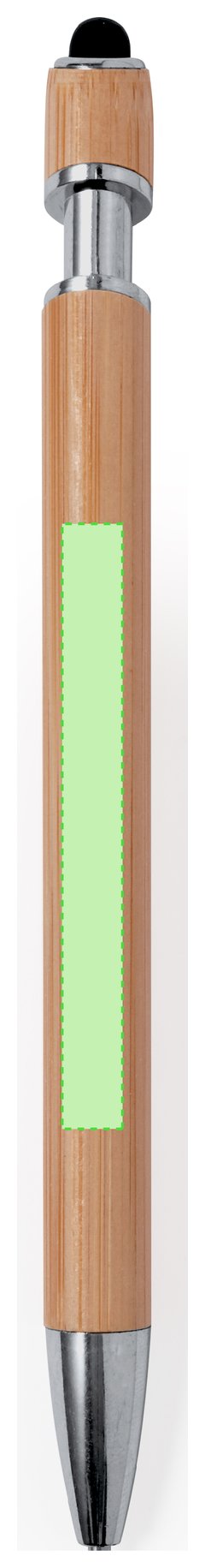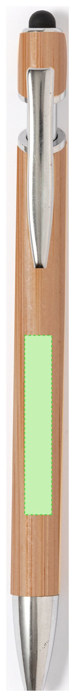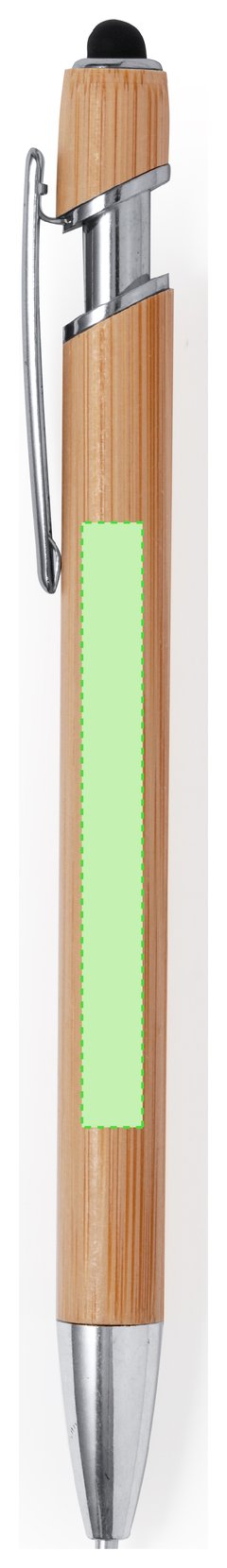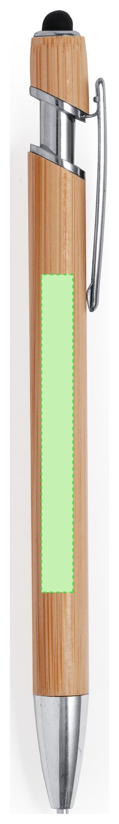 Bolígrafo puntero de mecanismo pulsador, con cuerpo en bambú, accesorios cromados y puntero en negro. Clip metálico y en tinta azul. Materiales como el bambú fomentan la utilización de materias primas naturales, reduciendo las emisiones contaminantes. Proviene de una planta de gran resistencia y versatilidad, con crecimiento y regeneración rápidos, siendo una excelente alternativa al uso de madera tradicional.