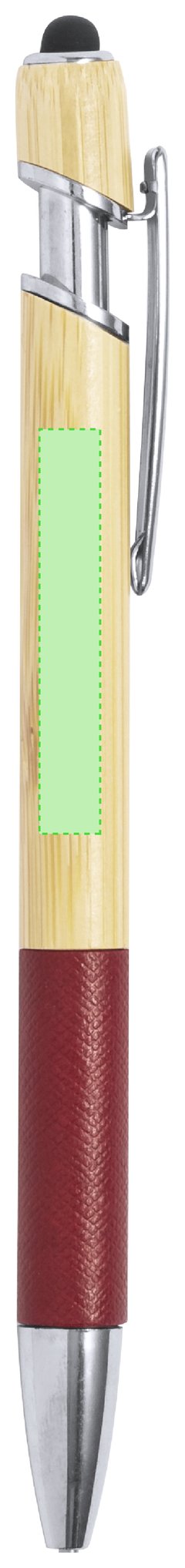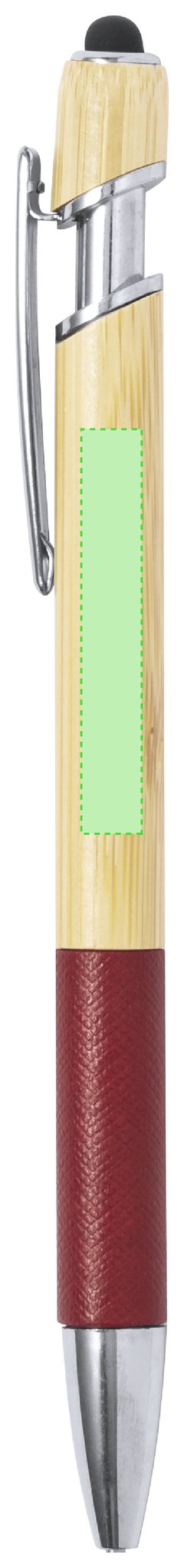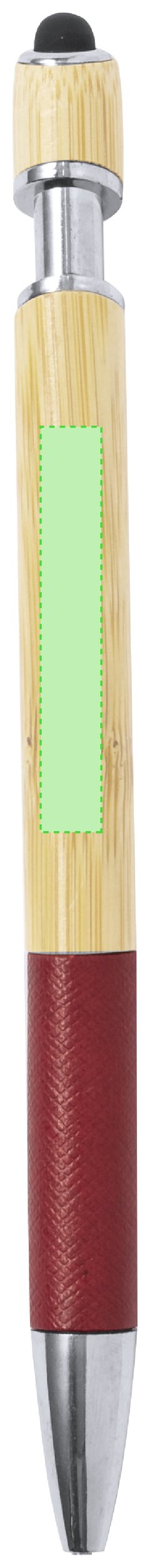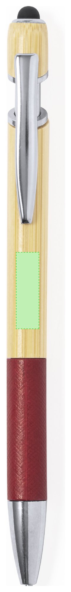 Bolígrafo puntero con cuerpo en bambú y papel reciclado. Caña fabricada en suave bambú con empuñadura hecha en cartón reciclado con textura y en variados colores. En la parte superior tiene un puntero negro. Clip metálico y accesorios en cromado. De mecanismo pulsador y en tinta azul. Elaborado con elementos vegetales para así fomentar la utilización de materias primas naturales y reducir las emisiones contaminantes.