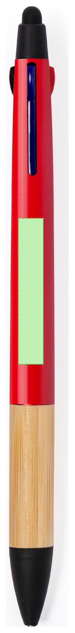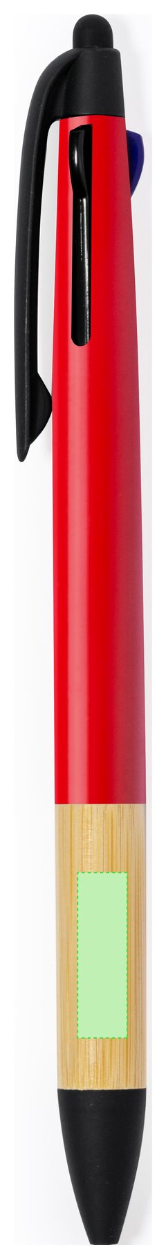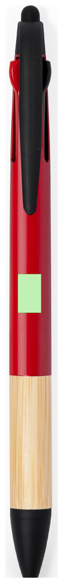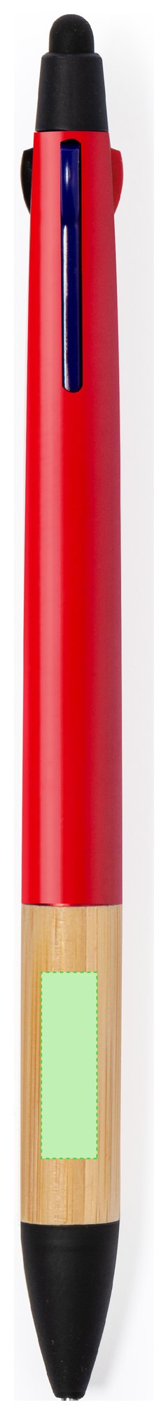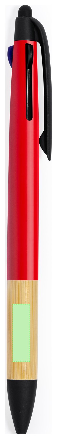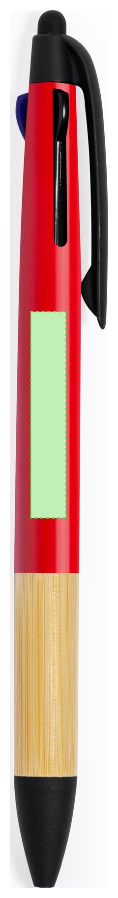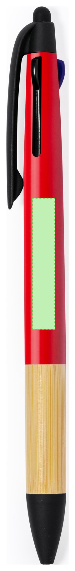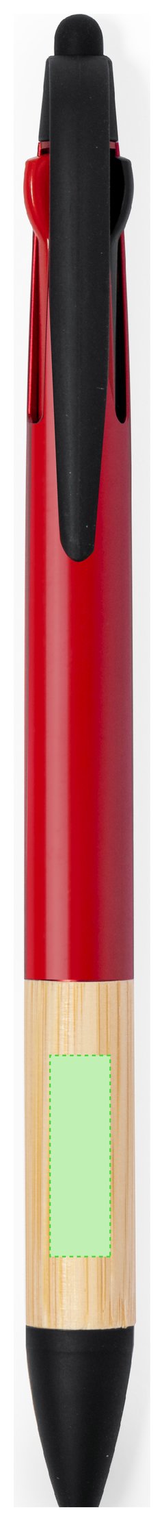 Práctico bolígrafo puntero con 3 tintas diferentes, hecho en bambú. De mecanismo pulsador con posibilidad de elegir entre tinta azul, roja o negra, con pulsadores a juego. Empuñadura en suave bambú, clip y punta en elegante negro y caña de variados y llamativos colores. Parte superior con puntero. Materiales como el bambú fomentan la utilización de materias primas naturales, reduciendo las emisiones contaminantes. Proviene de una planta de gran resistencia y versatilidad, con crecimiento y regeneración rápidos, siendo una excelente alternativa al uso de madera tradicional.