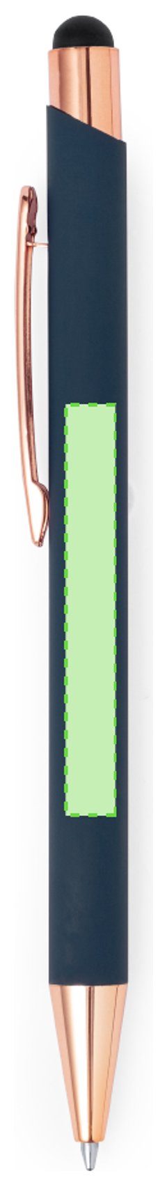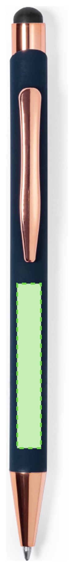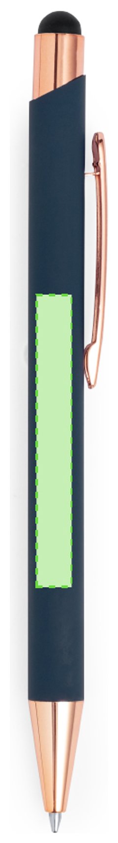 Bolígrafo puntero de tacto goma especialmente diseñado para el marcaje en láser con logotipo en color rosado. De mecanismo pulsador, con clip metálico y accesorios en acabado cobre. Cuerpo disponible en 4 distinguidos colores, de cartucho jumbo y en tinta azul. Presentado en elegante caja de diseño negra.
