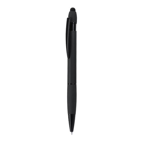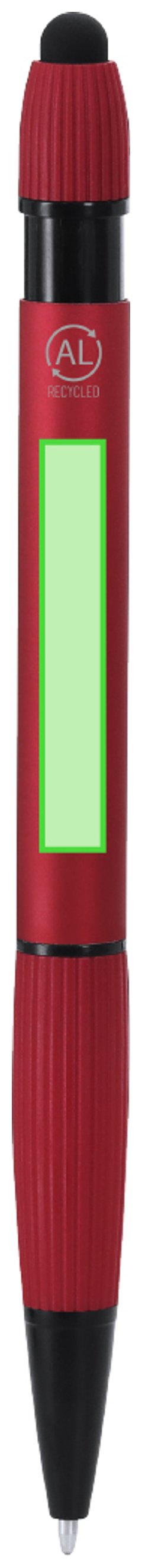 Bolígrafo puntero con cuerpo en Aluminio reciclado. Empuñadura de acabado gomoso. En la parte superior tiene un puntero negro. Clip metálico y accesorios en negros. En tinta azul.Distintivo aluminio reciclado en la parte superior del bolígrafo.