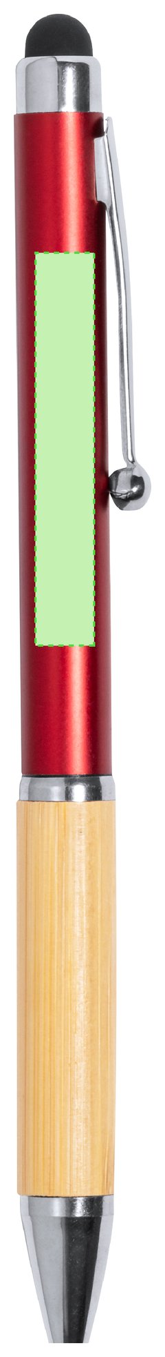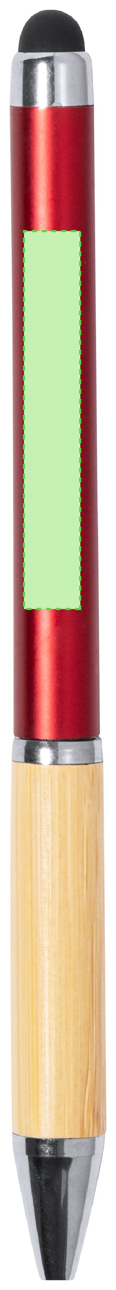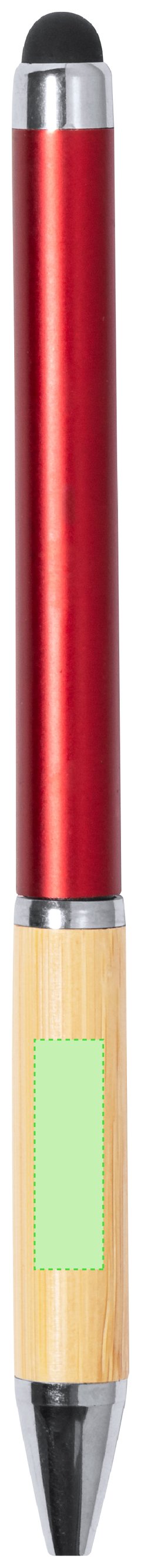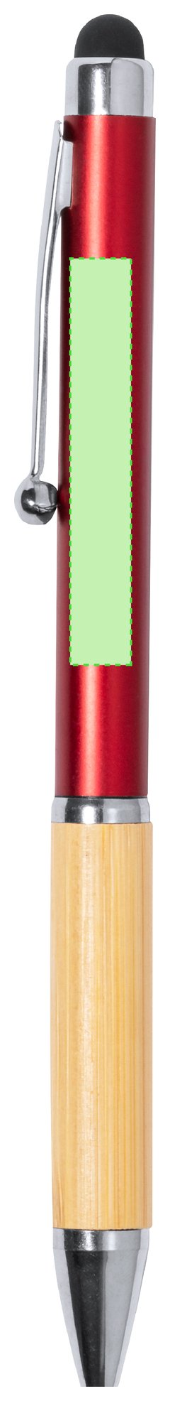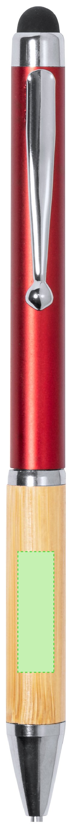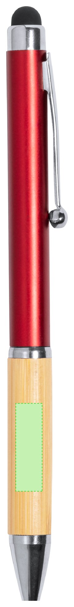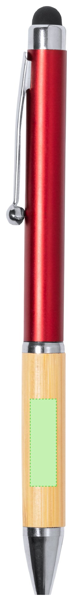 Elegante bolígrafo puntero de bambú y ABS. Cuerpo en acabado brillante y empuñadura en bambú con puntero en la parte superior en negro, con la caña en una amplia gama de distintivos colores metálicos. Clip metálico, con mecanismo giratorio y en tinta azul. Presentado en bolsa individual reciclada. Materiales como el bambú fomentan la utilización de materias primas naturales, reduciendo las emisiones contaminantes. Proviene de una planta de gran resistencia y versatilidad, con crecimiento y regeneración rápidos, siendo una excelente alternativa al uso de madera tradicional.