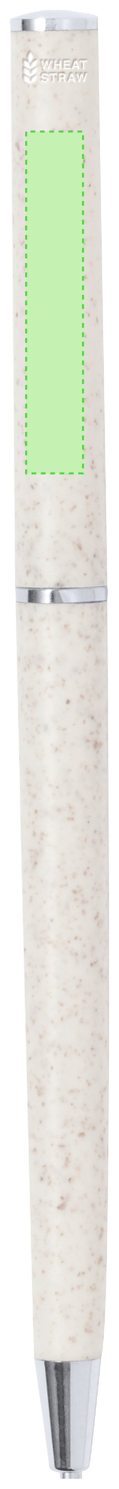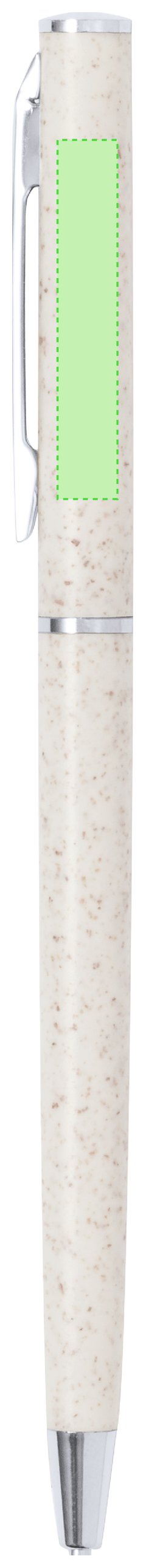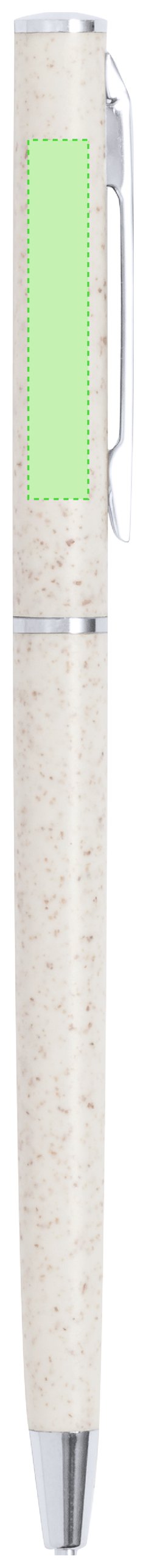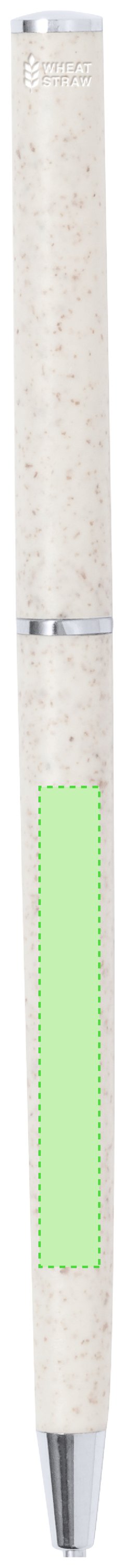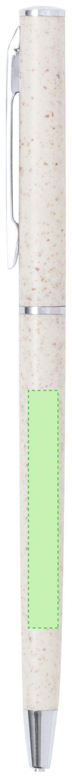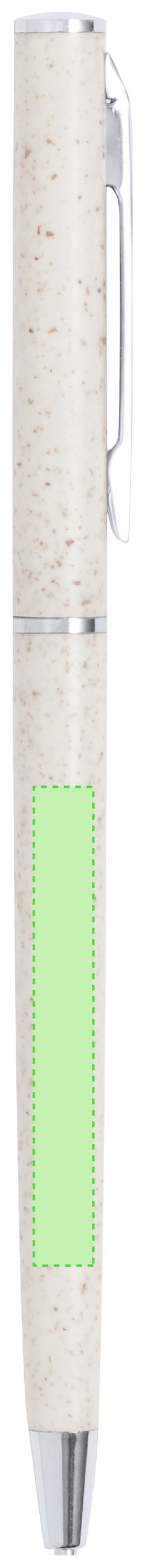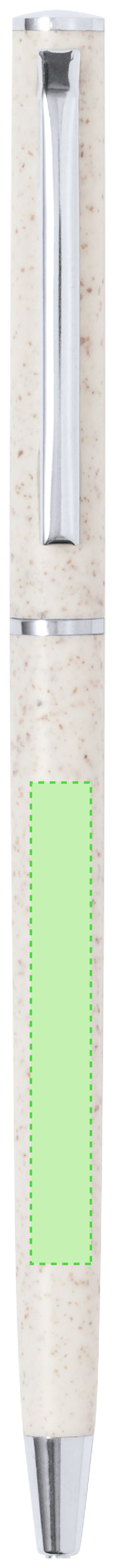Bolígrafo con cuerpo en caña de trigo. Clip metálico y accesorios cromados. De mecanismo giratorio y de tinta azul. Con logotipo caña de trigo y disponible en color nature. La caña de trigo fomenta la utilización de materias primas naturales, reduciendo así las emisiones contaminantes.