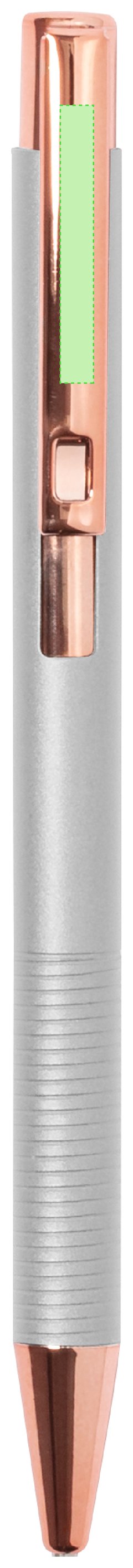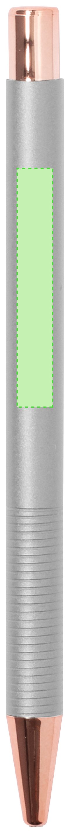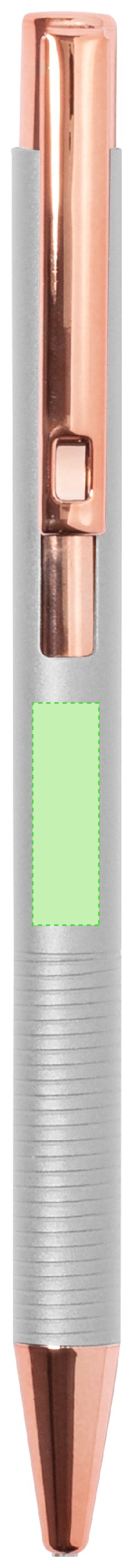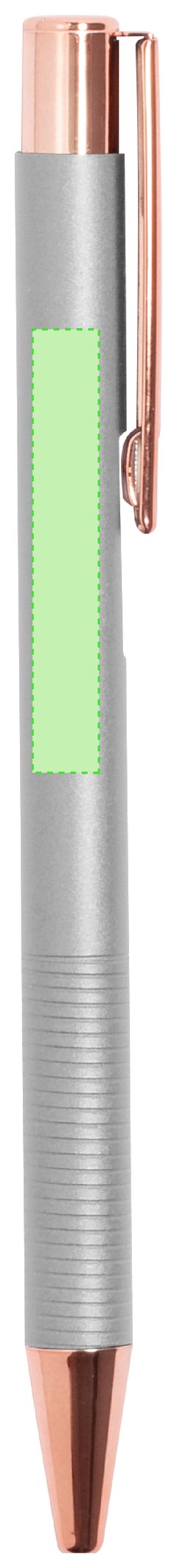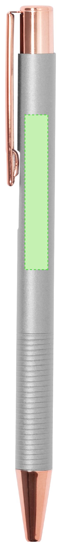 Excelente bolígrafo de aluminio con mecanismo pulsador. Cuerpo en resistente aluminio de acabado mate con elementos decorativos de elegante acabado color cobre, con la caña en una amplia gama de distintivos colores. Clip metálico, con pulsador retráctil de tinta azul y carga jumbo. Presentado en una bolsa individual reciclada.