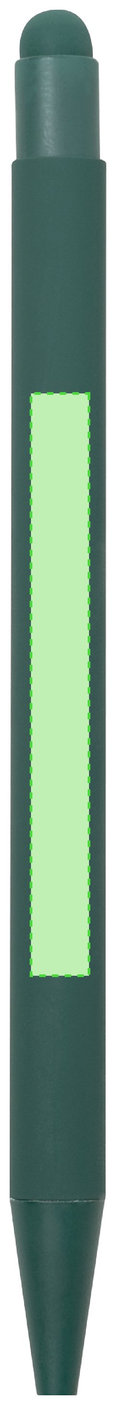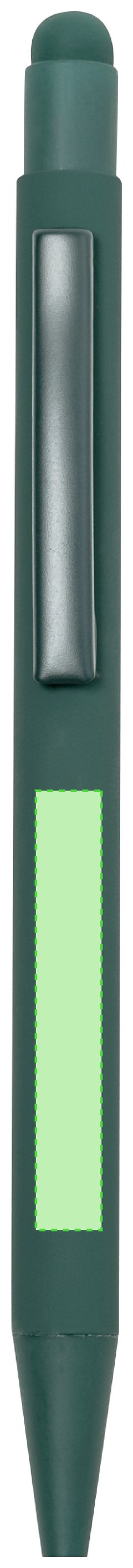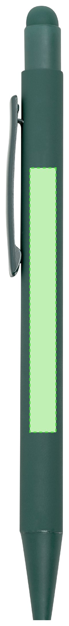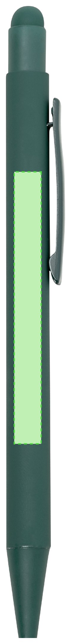 Bolígrafo puntero fabricado en aluminio. De mecanismo pulsador con puntero y clip metálico a juego con el cuerpo. Cuerpo terminación en goma, especialmente diseñado para marcaje en láser. De cartucho jumbo y en tinta azul.