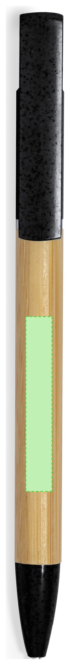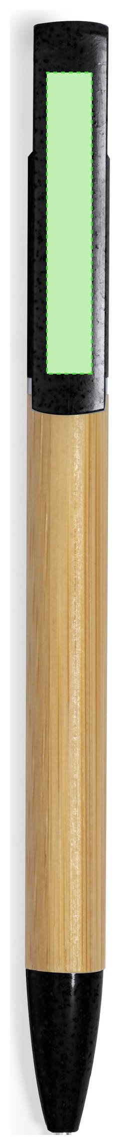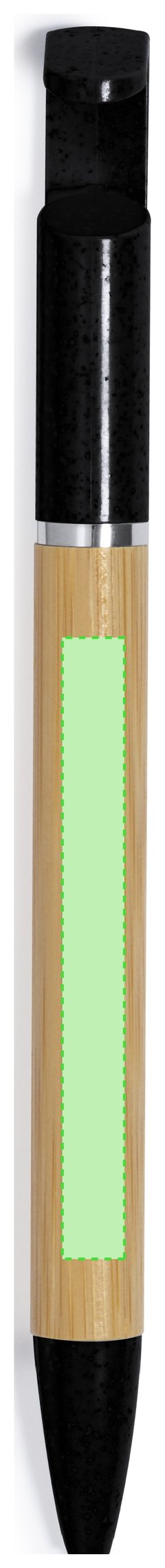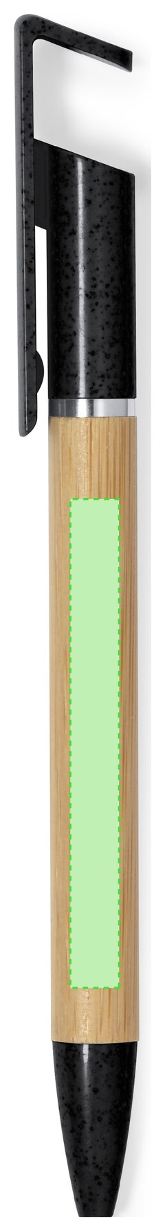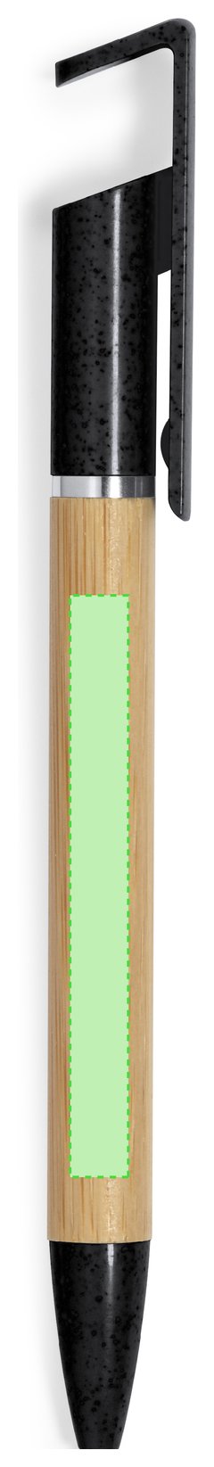 Práctico bolígrafo soporte fabricado en bambú y caña de trigo. Cuerpo en bambú, con accesorios en caña de trigo a color y elementos decorativos metálicos. De mecanismo giratorio, con soporte integrado en clip para dispositivo móvil. En tinta azul, con carga jumbo y disponible en variados colores. Materiales como el bambú fomentan la utilización de materias primas naturales reduciendo las emisiones contaminantes. Además, el bambú proviene de una planta de gran resistencia y versatilidad, con crecimiento y regeneración rápida, siendo una excelente alternativa al uso de madera tradicional.
