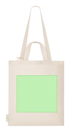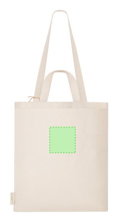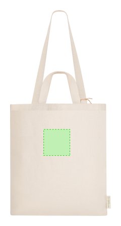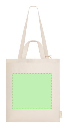 Bolsa confeccionado principalmente en algodón reciclado de 140g/m2. Cuenta con doble asa: asas largas de 70 x 2,5 cm y asas cortas de 30 x 2,5 cm. Incluye distintivo de Algodón Reciclado. Resistencia hasta 6 kg de peso.