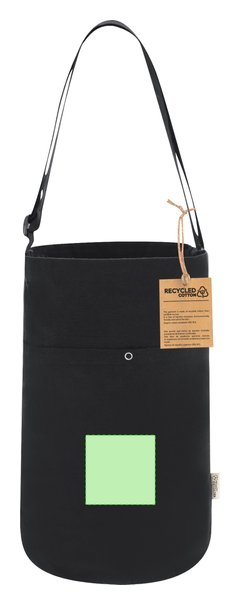 Bolsa fabricada en canvas reciclado de 270g/m2. Original forma cilíndrica de gran capacidad, con compartimento principal, bolsillo auxiliar interior y práctico bolsillo exterior con cierre de broche metálico. En elegante color negro, de acabado cosido y con asa larga reforzada ajustable. Logotipo Algodón Reciclado en etiqueta exterior.
