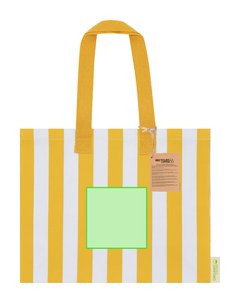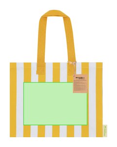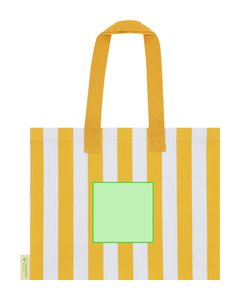 Bolsa en Algodón Reciclado de 310 g/m2. Asas largas de 70cm con refuerzo, de acabado cosido y fuelle en base y laterales. Logotipo en etiqueta lateral y resistencia hasta 10 kg de peso. Con diseño a rayas verticales blancas intercaladas con color.