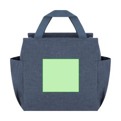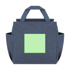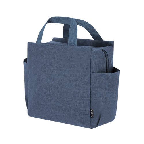 Bolsa nevera isotérmica confeccionada en poliéster RPET 600D. Compartimento principal acolchado con cierre de cremallera con tirador metálico. En los laterales cuenta con bolsillos abiertos, y asar para fácil transporte en la parte superior.