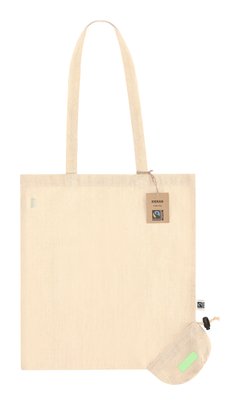 Bolsa plegable confeccionada principalmente en algodón de 120g/m2. Con certificación Fairtrade (Comercio Justo) un sistema comercial solidario y alternativo al convencional que persigue el desarrollo de los pueblos y la lucha contra la pobreza. De acabado cosido, con asas largas de 70cm y resistencia hasta 6kg de peso. Con accesorio de ajuste para fácil plegado. Incluida etiqueta Fairtrade y hangtag distintivo en cartón reciclado.