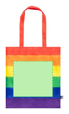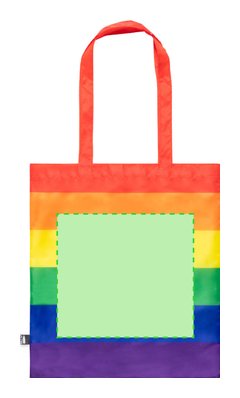 Bolsa Rainbow multicolor, fabricada en RPET 210T. De acabado cosido y asas largas reforzadas (70 x 2,5 cm). Todo un orgullo de bolsa, con distintivo RPET en etiqueta exterior. El material RPET se elabora a partir de plástico reciclado, para así fomentar la reutilización de residuos plásticos y ayudar a la sostenibilidad del planeta.
