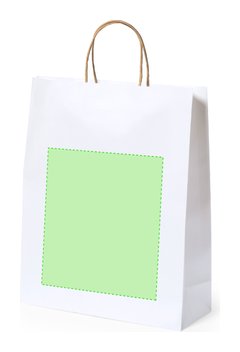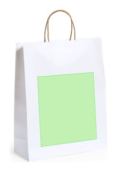 Bolsa de línea nature, fabricada en papel reciclado acabado en blanco de 100g/m2, con asas cortas reforzadas en tono natural y fuelle. Resistencia hasta 6 kg de peso.