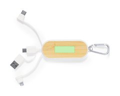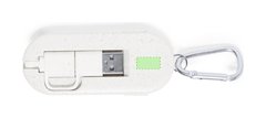 Cable cargador con mosquetón fabricado en fibra de trigo y bambú. Con conexiones de entrada Tipo C y USB y salidas Tipo C, lightning y Micro USB. 5V DC 2A. Presentado en bolsa individual de diseño kraft. Elaborado con elementos vegetales para así fomentar la utilización de materias primas naturales y reducir las emisiones contaminantes.