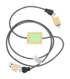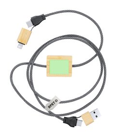 Cable cargador de 60 W en una combinación de RPET y bambú. Con conexiones de entrada Tipo C y USB y conexiones de salida Lightning, Micro USB y Tipo C. Potencia de carga: Hasta 60W, asegurando una carga rápida y eficiente.