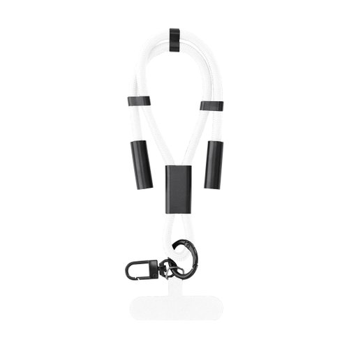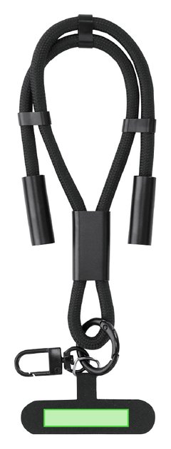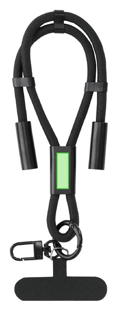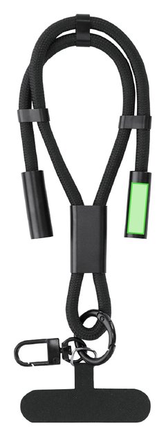 Pulsera con función de soporte y cable cargador, fabricado en una combinación de poliéster RPET. Diseñado para colocarse fácilmente entre la funda y el smartphone gracias a su accesorio de transporte. Incluye cinta a juego, mosquetón metálico giratorio en color negro y accesorio para ajuste en muñeca. Ofrece funcionalidad de carga y traspaso de datos, con entrada Tipo C 60W, y salidas Tipo C.
