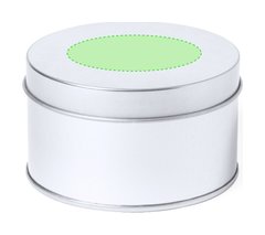 Caja de presentación formato redondo, fabricada en resistente metal de acabado plateado y con tapa a juego.
