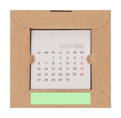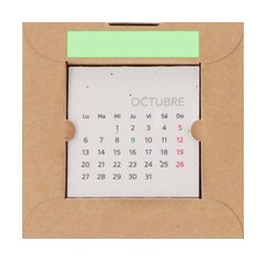 Calendario plantable fabricado en papel de semilla. Incluye 13 hojas con semillas de petunia de colores surtidos, convirtiéndolo en papel plantable después de su vida útil. Diseño de mes en curso, con festividades nacionales marcadas en rojo y autonómicas en verde. Presentado en caja soporte de cartón.